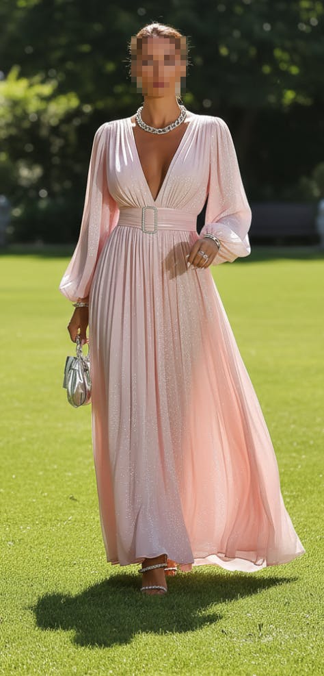 Crystal-Accented Buckle Belt: A wide, matching chiffon belt cinches the waist, defining the figure and elevating the dress’s luxe aesthetic.