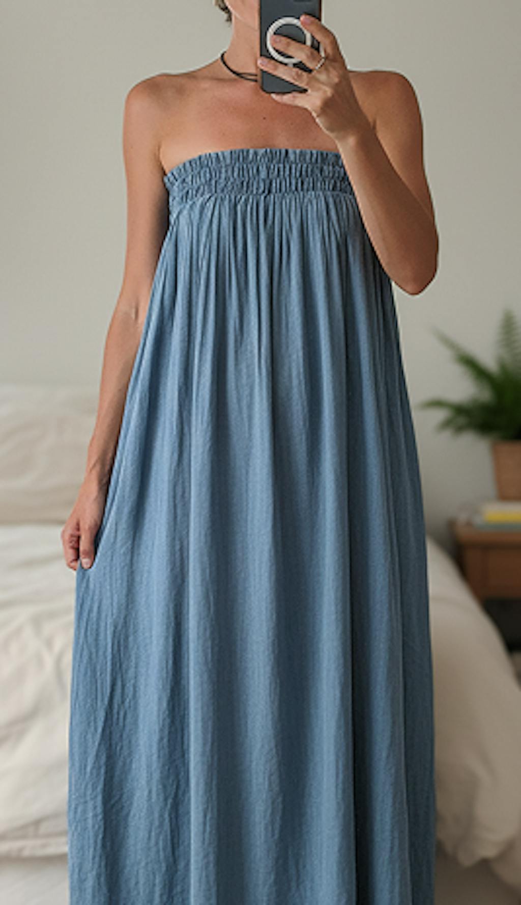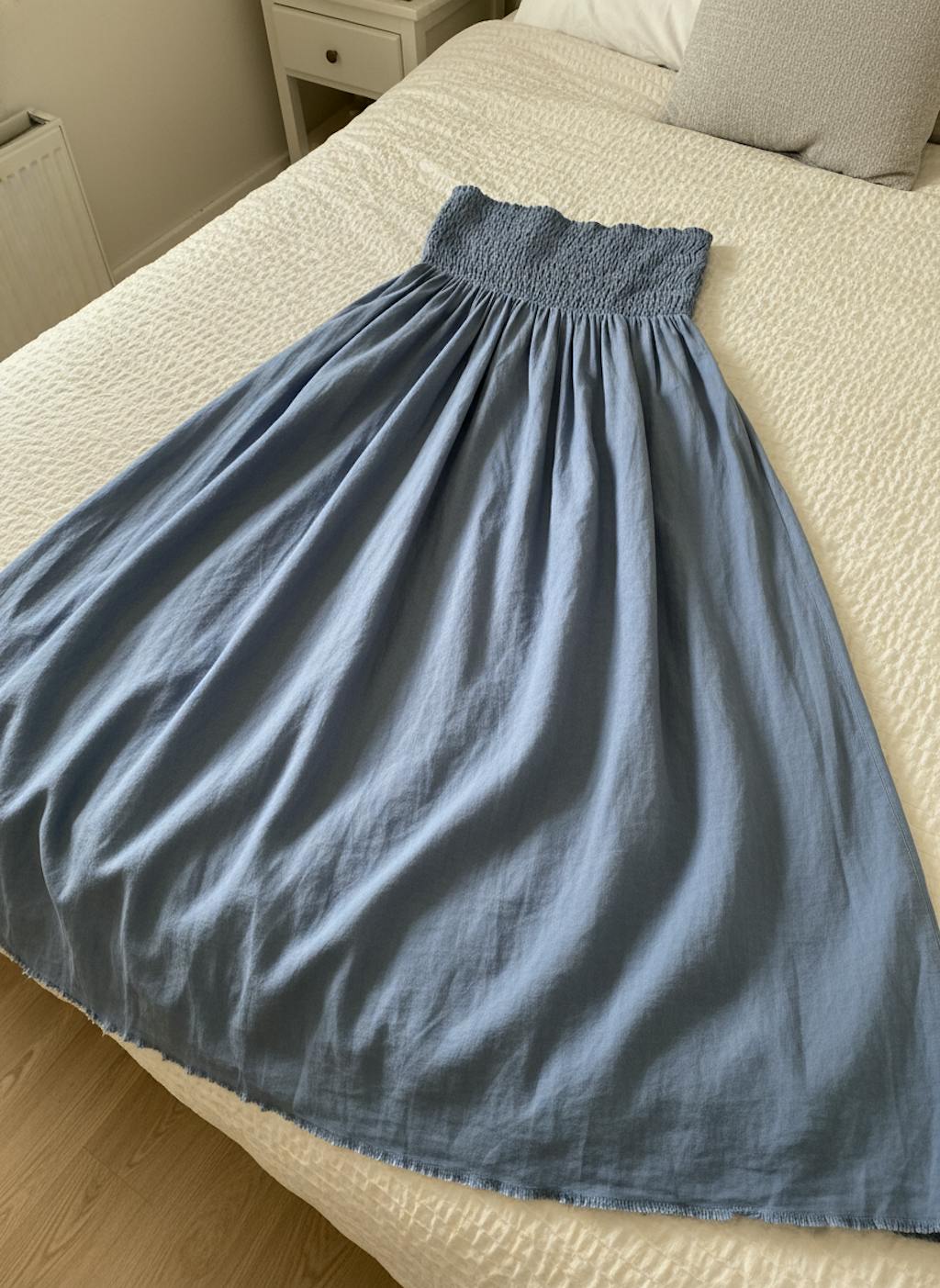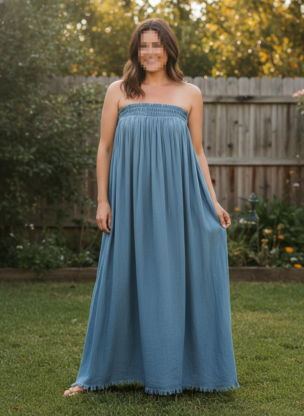 A refined take on classic denim. Crafted from premium lightweight washed denim, this strapless maxi dress offers breathable comfort with a structured yet fluid drape. The elastic smocked neckline ensures a secure, flattering fit without compromising ease of movement.